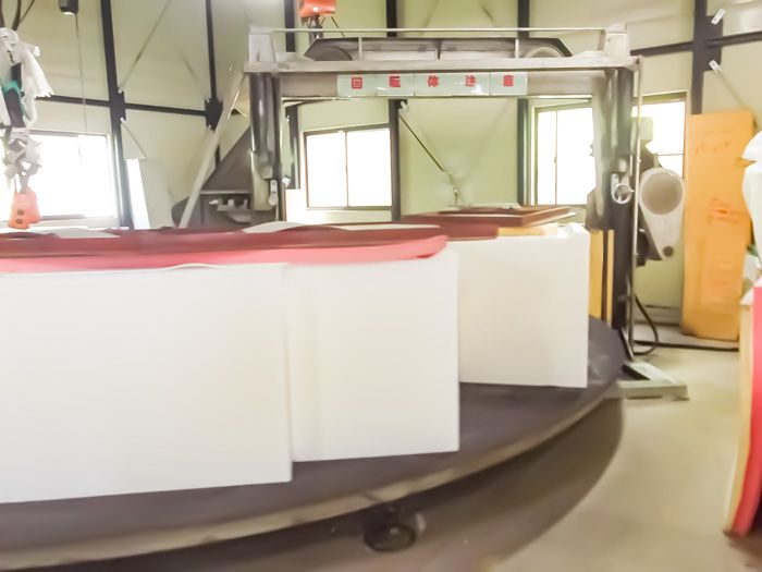 ウレタンマットレスの工場に行くと、体育館よりもっと大きな建物の中で、巨大なパンがニューっと吐き出されるような感じで、ウレタンができあがってきます。