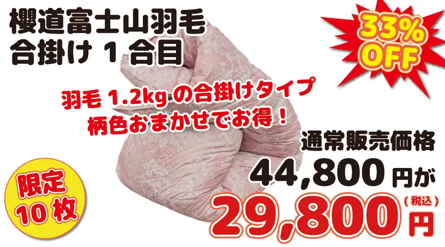 【感謝祭001/限定10枚】櫻道富士山羽毛 合掛け【1合目】シングル150cm×210cm 柄色おまかせ (中身:中国ホワイトダック ダウン85% フェザー15% / 充填量:1.2kg / 側生地:ポリエステル85% 綿15% / 縫製:立体キルト) (セール限定大特価!販売価格44800円⇒29800円 )