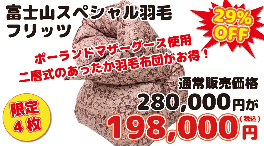 【感謝祭004/限定4枚】富士山スペシャル羽毛【フリッツ】 シングル150cm×210cm フリッツ(ピンク) (中身:ポーランドマザーグース ダウン93% フェザー7% / 充填量:1.3kg / 側生地:綿100%(100番手) / 縫製:デュアルキルト) (セール限定大特価!販売価格280000円⇒198000円 )