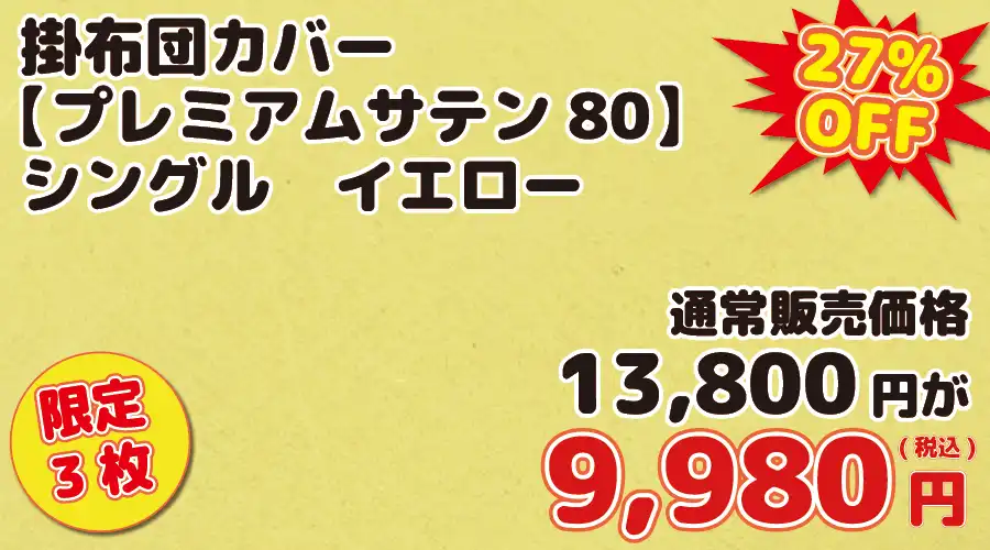 【感謝祭021/限定3枚】掛布団カバー【プレミアムサテン80】シングル150cm×210cm イエロー 8ヵ所ひも付き (セール限定大特価!販売価格13800円⇒9980円 )