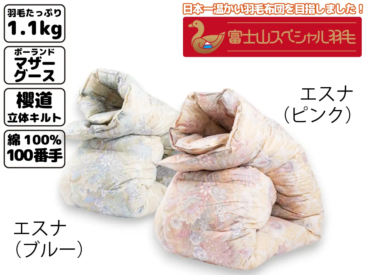 【アウトレット510/限定1枚】富士山スペシャル羽毛 合掛け【6合目】シングル150cm×210cm エスナ(ピンク) (中身:ポーランドマザーグース ダウン93% フェザー7% / 充填量:1.1kg / 側生地:綿100%(100番手) / 縫製:櫻道立体キルト) (《B品》カタログ撮影品 処分のため販売価格250000円⇒148000円 )