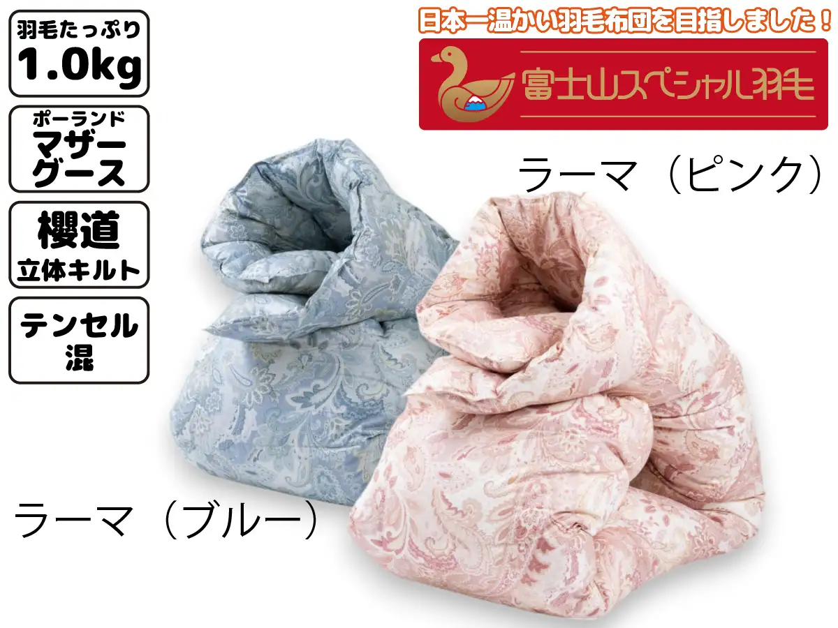 【アウトレット512/限定1枚】富士山スペシャル羽毛 合掛け【7合目】シングル150cm×210cm ラーマ(ピンク) (中身:ポーランドマザーグース(コウダ種) ダウン95% フェザー5% / 充填量:1.0kg / 側生地:ポリエステル40% 綿33% テンセル27% / 縫製:櫻道立体キルト) (《B品》カタログ撮影品 処分のため販売価格340000円⇒200000円 )