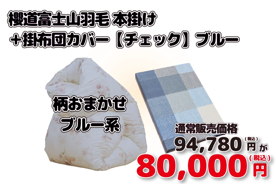 【新生活024/限定2枚】櫻道富士山羽毛 本掛け シングル150cm×210cm 柄おまかせブルー系 (中身:イングランドダック ダウン90% フェザー10% / 充填量:1.5kg / 側生地:綿100%(60番手) / 縫製:デュアルキルト) + 掛布団カバー【チェック】ブルー (セール限定販売価格94780円相当⇒80000円 )
